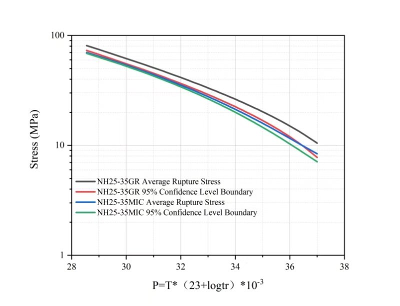 应力断裂曲线显示(图1),NH25-35GR的平均断裂应力及95%置信区间均高于NH25-35微合金,表明其高温蠕变性能显著提升。在相同服役条件下,NH25-35GR的高温强度较传统材料提高至少15%。